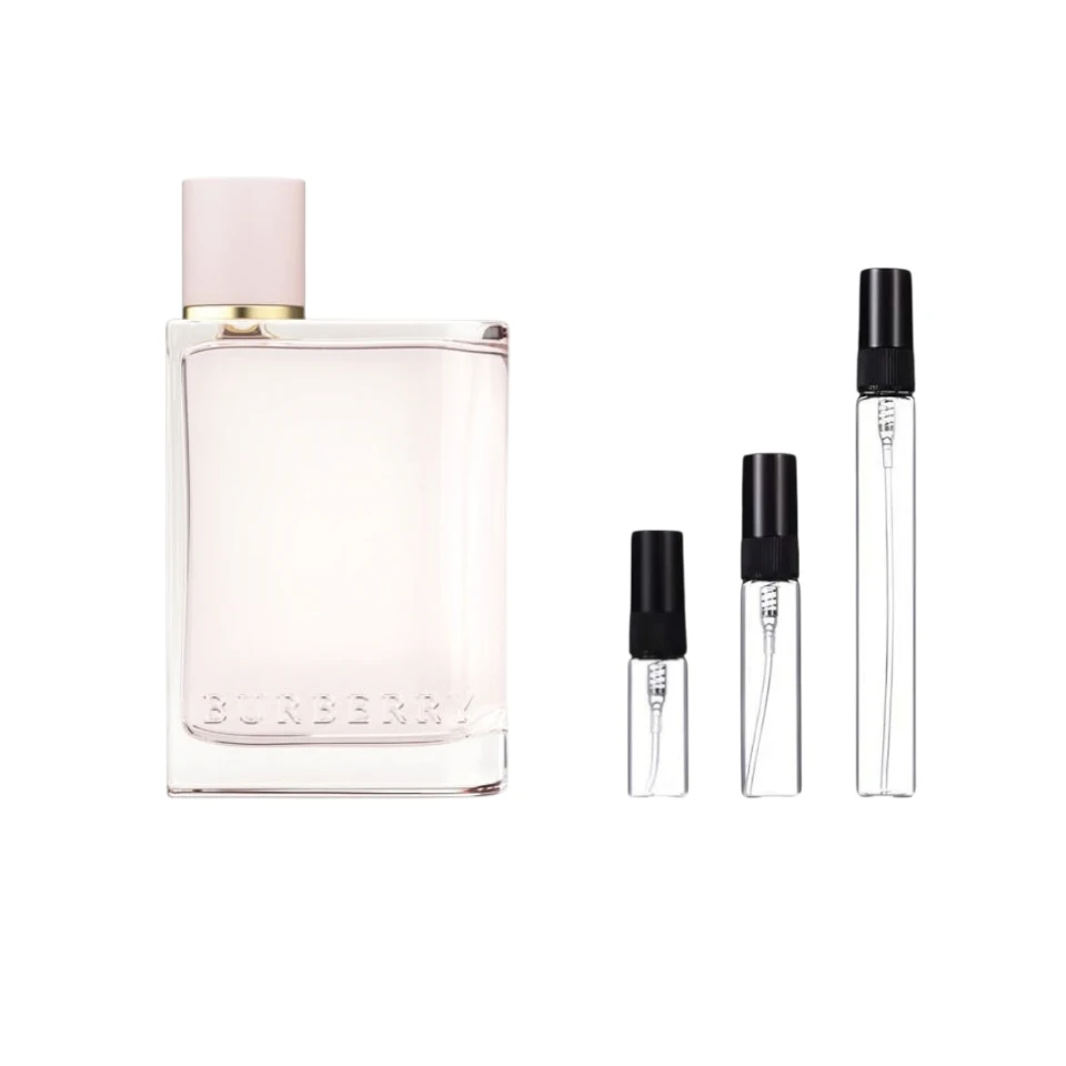 Los Decants Burberry Her Eau De Parfum ofrecen un aroma dulce y moderno con notas de fresa, frambuesa, violeta y almizcle blanco. Ideales para uso diario, citas y momentos donde quieras proyectar frescura, feminidad y un estilo juvenil con una estela duradera y adictiva.