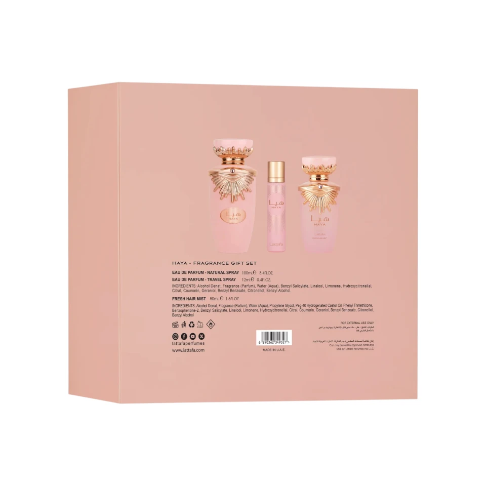 Además del perfume principal, el Estuche Lattafa Haya incluye un perfumero de 12 ml, ideal para llevar siempre contigo y mantener la fragancia en cualquier momento del día. También incorpora un perfume para el cabello de 50 ml, diseñado para aportar frescura y suavidad sin dañar la fibra capilar, dejando una estela delicada y femenina. Este set es perfecto para momentos especiales como cenas románticas, celebraciones íntimas o reuniones sociales, pero también se adapta al uso diario, aportando confianza y estilo en cada encuentro.