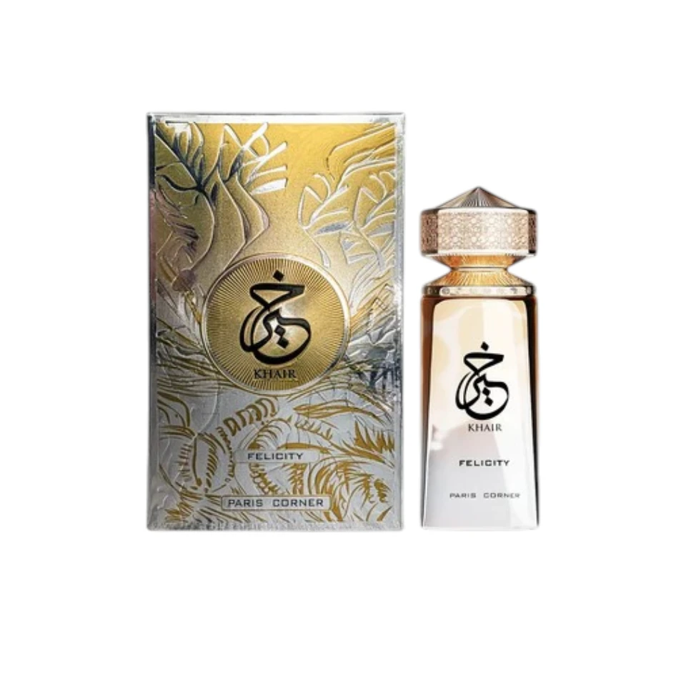 Paris Corner Khair Felicity es una fragancia luminosa y sofisticada que combina cítricos frescos, flores delicadas y acordes dulces sobre una base cálida de almizcle, maderas y ámbar. Perfecta para cualquier ocasión, su estela envolvente transmite alegría, confianza y elegancia, convirtiéndose en un aliado versátil para destacar tanto de día como de noche.